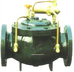 當閥門從進口端給水時,水流過針閥進入主閥控制室,出口壓力通過導管作用到導閥上。當出口壓力高于導閥彈簧設定值時,導閥關閉。控制室停止排水,此時主閥控制室內壓力升高并關閉主閥,出口壓力不再升高。